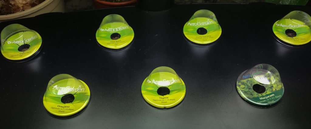 After months of growing Basil, I decided it was time to start a new bunch of herbs. Out went that faithful Basil. I think this is Thai Basil, Oregano, Thyme, Dill, Chives, Marjoram, and Parsley. Not the best shot under those grow lights.