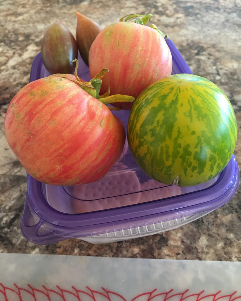 Here are a few of the many varieties of tomatoes I am harvesting. These all are ripe and such unusual colors. So many more to come on my 36 plants. Walt says they are so much better tasting than the ones from the store.