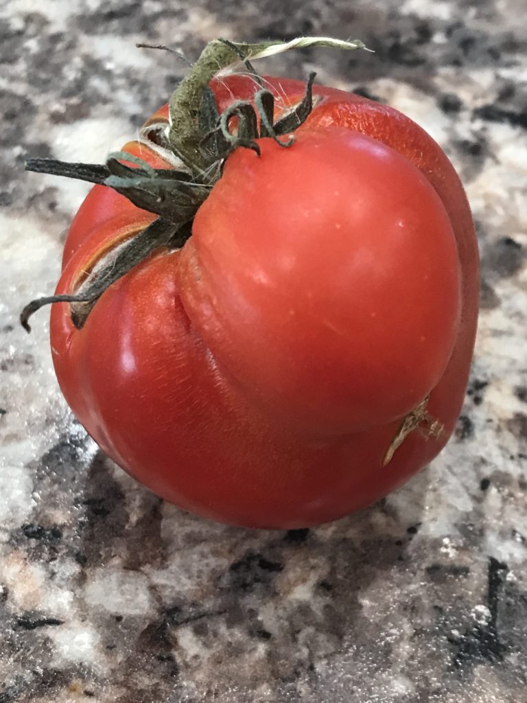 This is the tomato with the bump. It is finally all ripe. The blog is so goofed up with the photos all messed up. I am going to try this one to see. I wish the messed up ones would return to normal. It did it again. So I will take a break until it works. Sad, because this is the beginning of my 13th year of doing a photo a day.