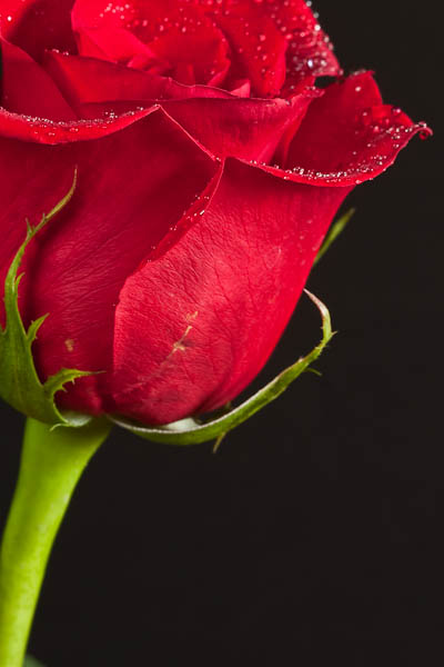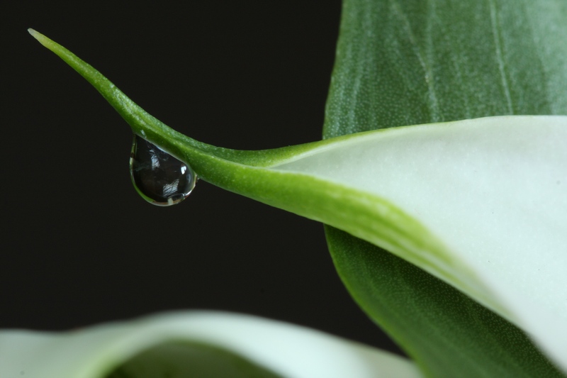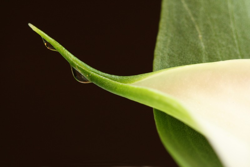 Monday, June 1- It actually feels like summer and looks like it too with wildflowers growing and leaves coming on the trees. A few of the lilacs survived that late frost. I must get down there to take a few shots of them. This is the Calla Lily that I bought a while back to do photos for my class. I had to do a water/dew shot for one of my assignments and this is what I submitted. I discovered these dewdrops on the tip of one of the lily flowers one morning and by the next morning they had converged into one big drop. I used incandescent lighting and reflector for the double drop shot and natural window light and reflector for the single. That is why the color difference.Â
