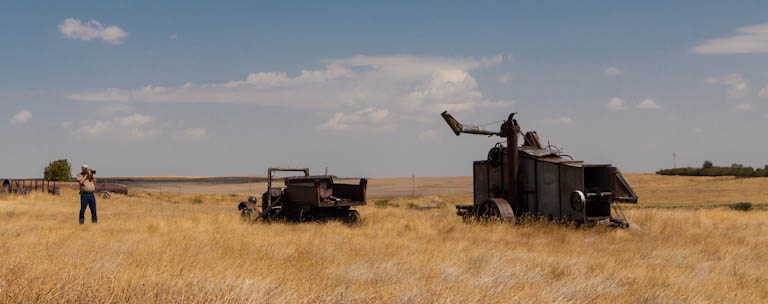 Saturday, September 22- Made a little trip to our ranch up in the foothills of the  Highwoods yesterday with friend, Kimmie. We found some fun things to take photos of and then drove on up to our summer pasture in the mountains. It is so dry up there and scary to even think of what would happen if lightning struck in that dry grass. The new wind farm is going in just east of our land and it is quite interesting. I am all for clean energy, but sure miss the beautiful mountains that used to be what one viewed. Guess I will have to enjoy capturing wind chargers that can be viewed up close. On our way home, we made a stop at the huge junk pile that we have at the shop. A photographer’s heaven for sure, complete with resident sheep.  Here is a shot of a couple of “retired” vehicles from our private haven.