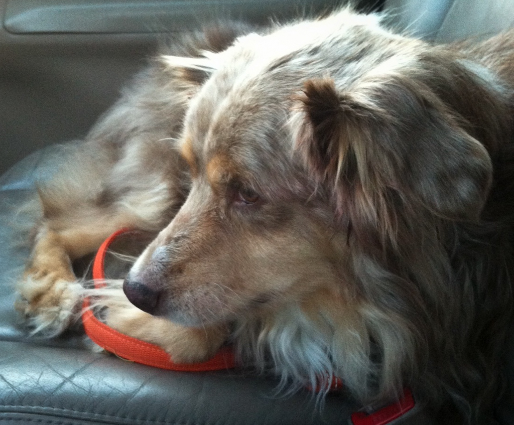 My daughter took Shep to the veterinarian yesterday to have his teeth cleaned today. He had to stay overnight because they gave him anesthesia for the procedure. I don’t see Shep cooperating when told to open wide and stay that way. He seemed to know all the way there that it was not going to be a fun experience. He is now on his way home and looks pretty dopey. Â He had one extraction, which isn’t fun for man nor beast. Hopefully, his breath will improve and be sweet smelling. Well, maybe that is too much to ask, but at least, more pleasant. If it was me, I would be eating my dinner through a straw tonight, but he is just fine eating normally. Dogs are much tougher than people! Why is it that so many of us dread the dentist? My dentist is a great guy and I still don’t like going to see him. Hmm. Could it be drills, needles, and the big bills? Shep, I sympathize with you! The top photo is on the way to the vet and the bottom was a little while ago on the way back home.
