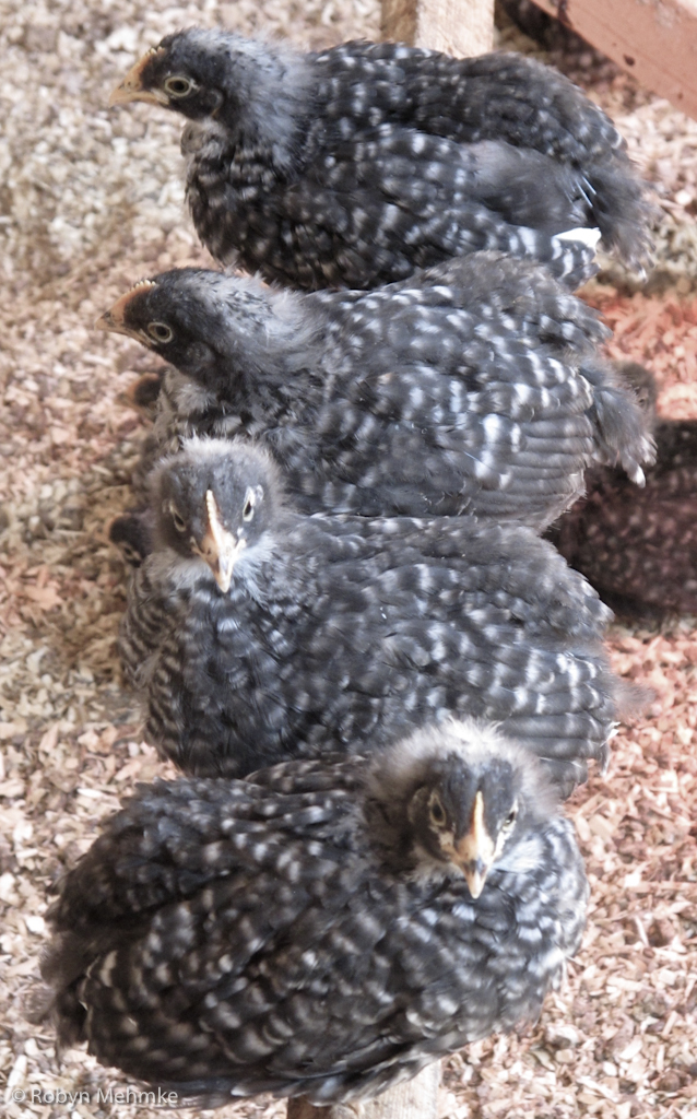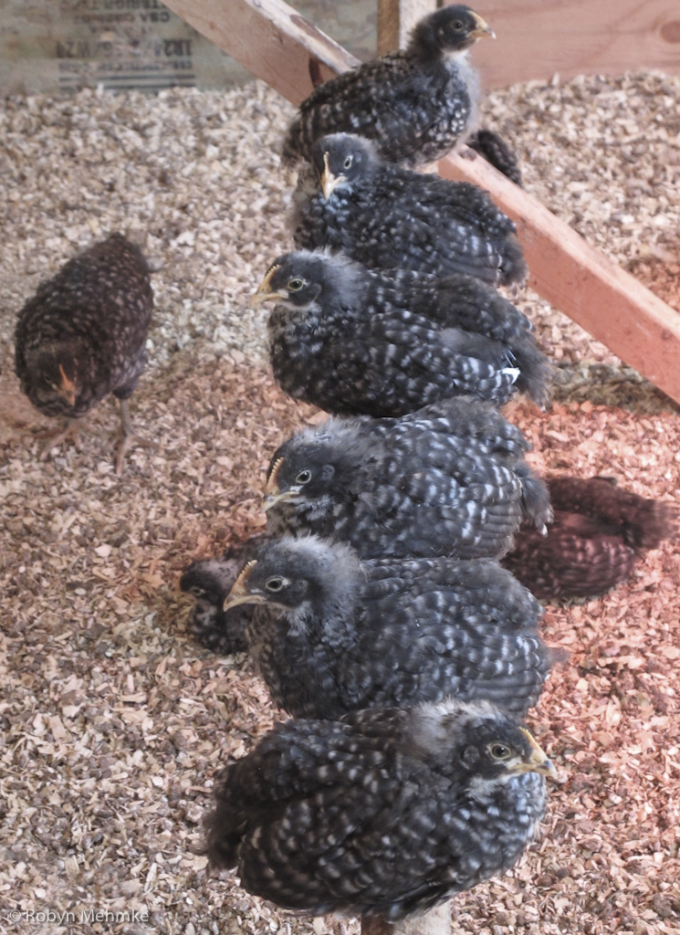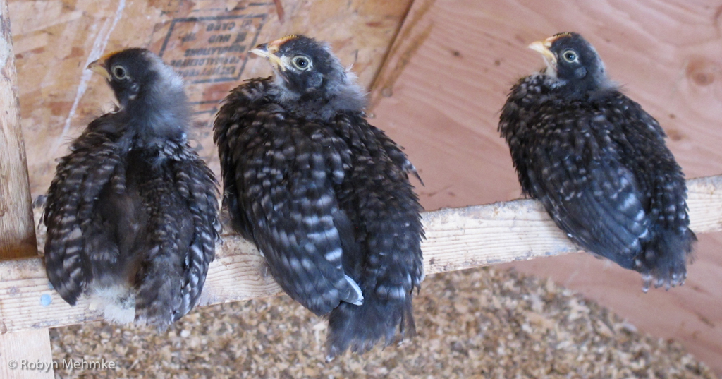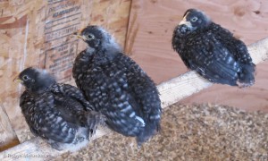 These three little Barred Rocks are great friends, as you can see. They are getting big enough to spend lots of time roosting instead of under the heat lamp.
