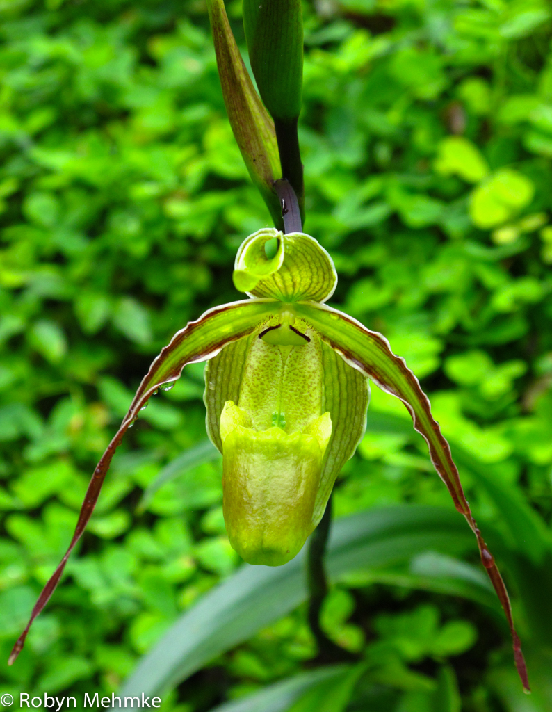 This green orchid blends right in with the surrounding foliage. This is one very green environment.