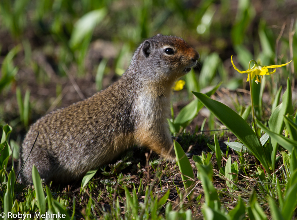 This little ground squirrel looked like he was on his way to smell that Glacier Lily. This was taken at Logan Pass where the snow was still rather deep.