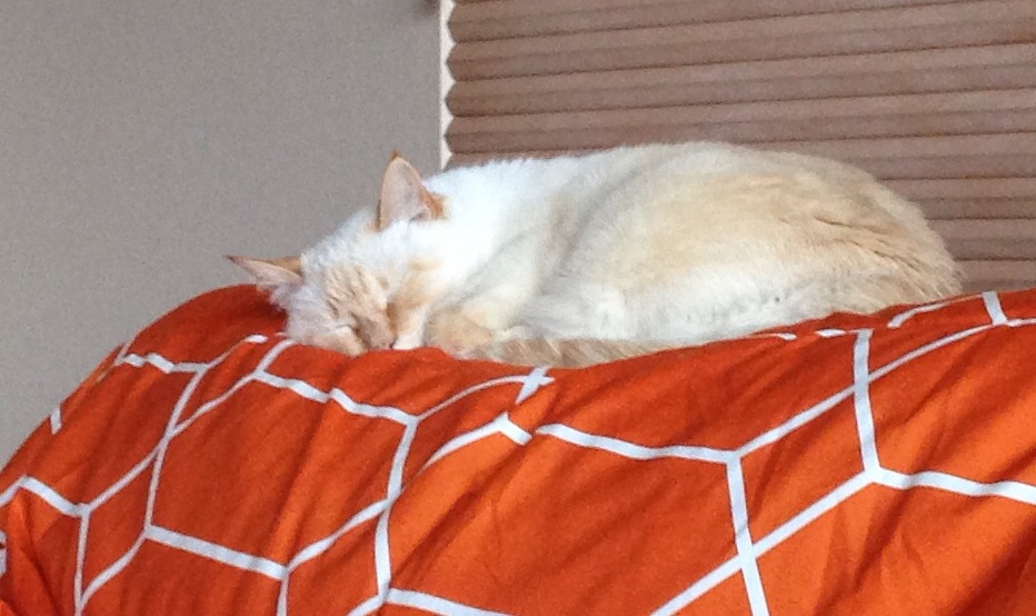 Jade found a place she thinks is pretty comfy and where she blends in. We cover the couch with a blanket to collect the cat hair and she loves it. She loves this house and remembers it well. It’s home!