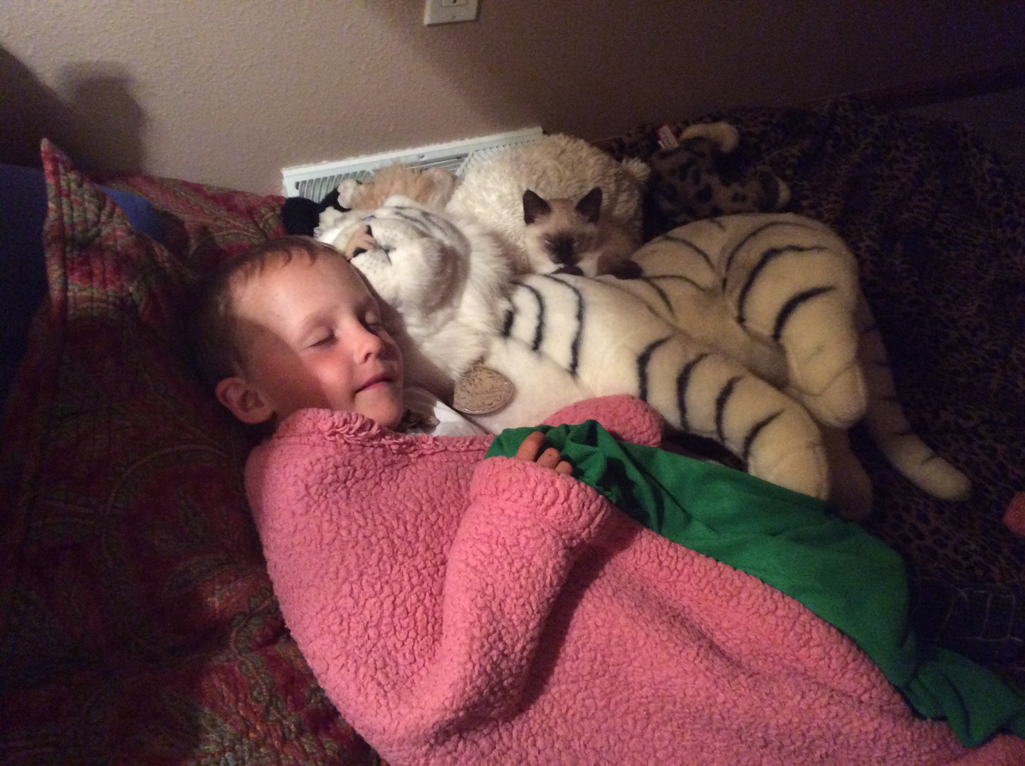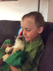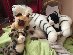 Bryton collects stuffed cats. However, now that he owns a real cat, can you find her in with his collection? Thanks, Tiffany, for supplying the photos.