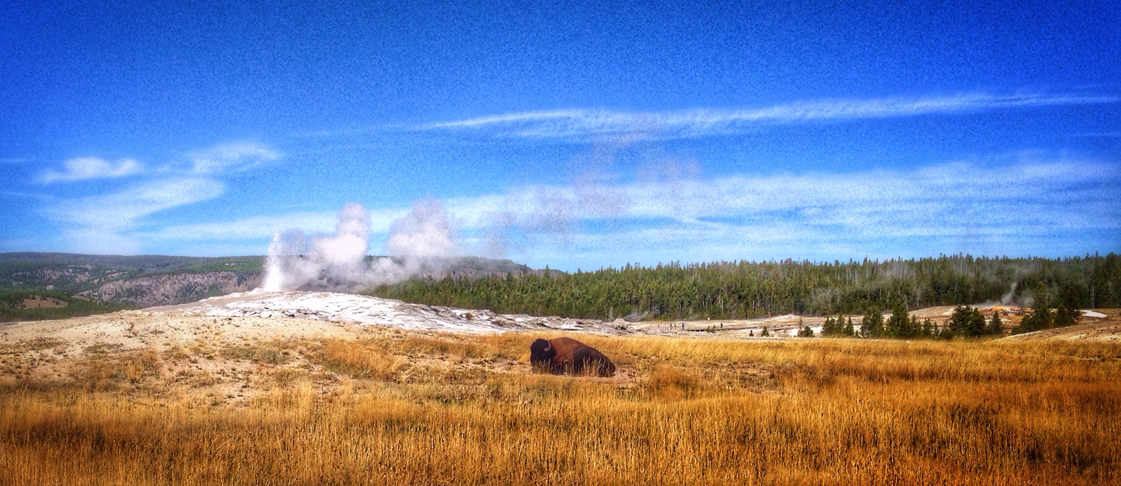 Ken and I are in West Yellowstone at a photography conference. Took a  ride, between meetings, over to Old Faithful. Our timing was great. This bison was just hanging out and could have cared less about the water spouting behind.