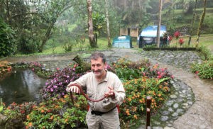I had the pleasure of being in an earthquake last year in Costa Rica. Well, I had to one up that, didn’t I? I was in not just one this time in Ecuador, but three. The first was 6.8 in the middle of the night and shook the bed really good. The guys next door actually fell out of bed. I could hear people screaming. The next day at noon another one hit at 7.2. I was inside this building shooting out the area that is right behind which has chairs to sit on and on the perfect level for photographing the hummingbirds perching outside. I actually thought that the kitchen staff right next to me was using a blender at first, as everything was shaking loudly. Next thing I knew, one of the staff came running out the kitchen screaming, “earthquake, get out”.  The things started falling off the counters and breaking in the kitchen about then. The whole building was rocking. When I got outside, I looked back and you could see the building swaying. There was a 7 year old grandchild of the owner there that was screaming with fear. It was pretty scary. The third was a mild 3.1 aftershock you barely could notice. It was quite the adventure! This is the building I was in(right behind the guys is where I was shooting out of). That is Charlie, Tom U, Steve, me and  Tom S right after the quake. It didn’t stop us from shooting for long. My tripod was still inside the building. There were actually 13 of us in all. This was at Mindo Loma.