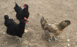 Three of my feathered friends waiting for their morning snack of  “scratch” which they get when they are first let out of their coop. That’s Ms. Americana in the front who is my blue/green egg layer. The other two are Black Sex Links that lay brown eggs.
