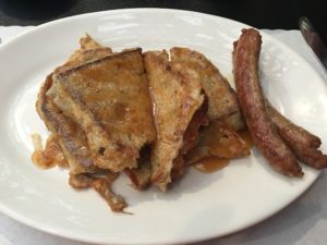 My first breakfast at the Star Bakery and Restaurant in Nevada City; Banana Bread French Toast with Sausage!