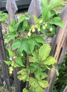 I am not sure if this is a Hops plant or not growing on the fence by one of the sweet cabins at the Nevada Hotel. Sure looks similar.