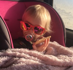 Here is how a girl travels – her Pinky, her Binky and a cracker. Can’t for get the sunglasses either.