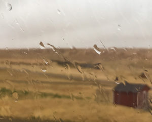 The wind blew last night so that there were Raindrops on the window. See the bales and chicken house?