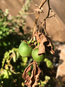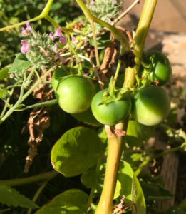 I finally took photos today of the tomato-like fruit that is growing my potato plants. Tomato and potato are both members of the nightshade family. When potatos flower at the end of their growing season they may turn into tomato -like fruit. These berries are not edible the berries contain solanine which is poisonous. There will be seeds inside these fruit that can be planted to grow potatoes. Check out online for more information.