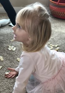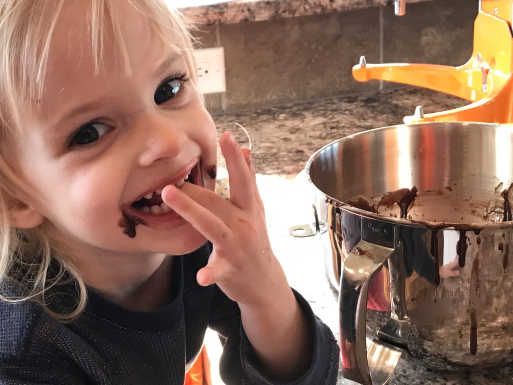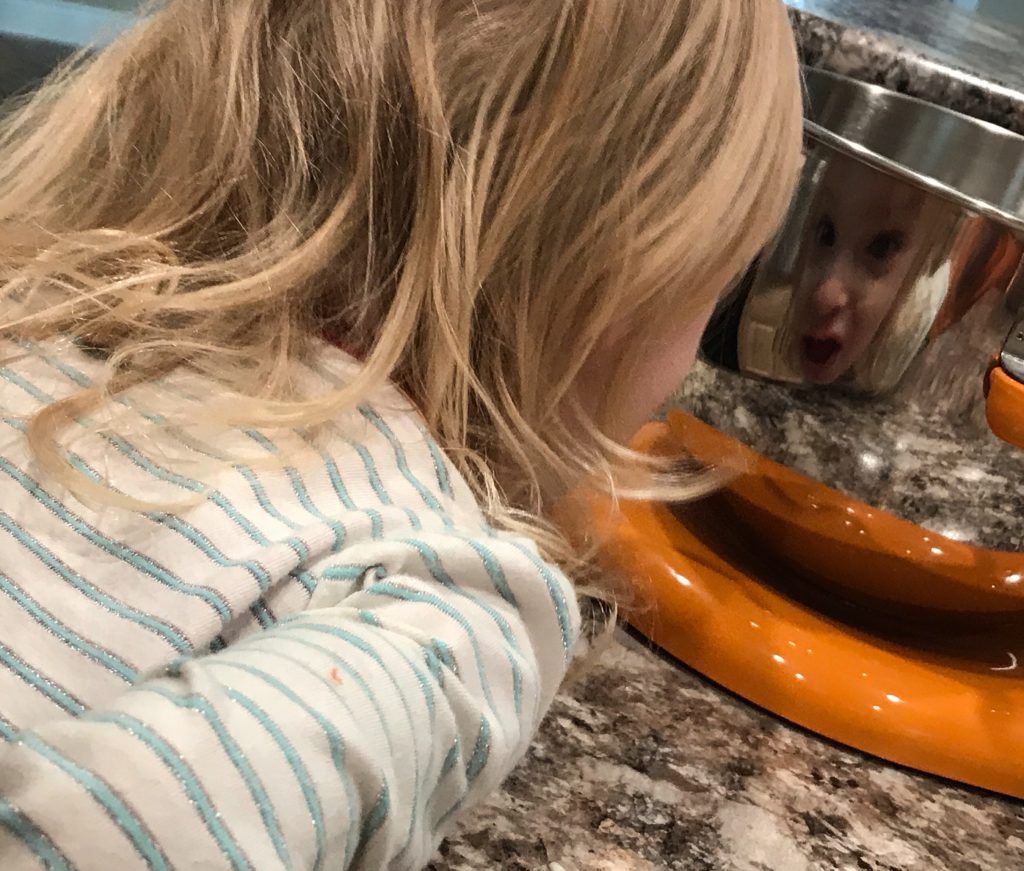 All a 3 year old needs to giggle is her reflection in a mixer bowl.