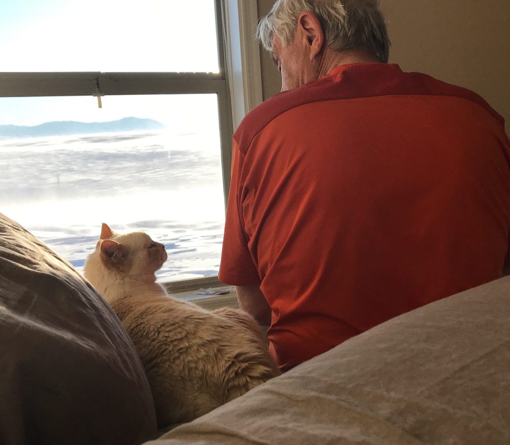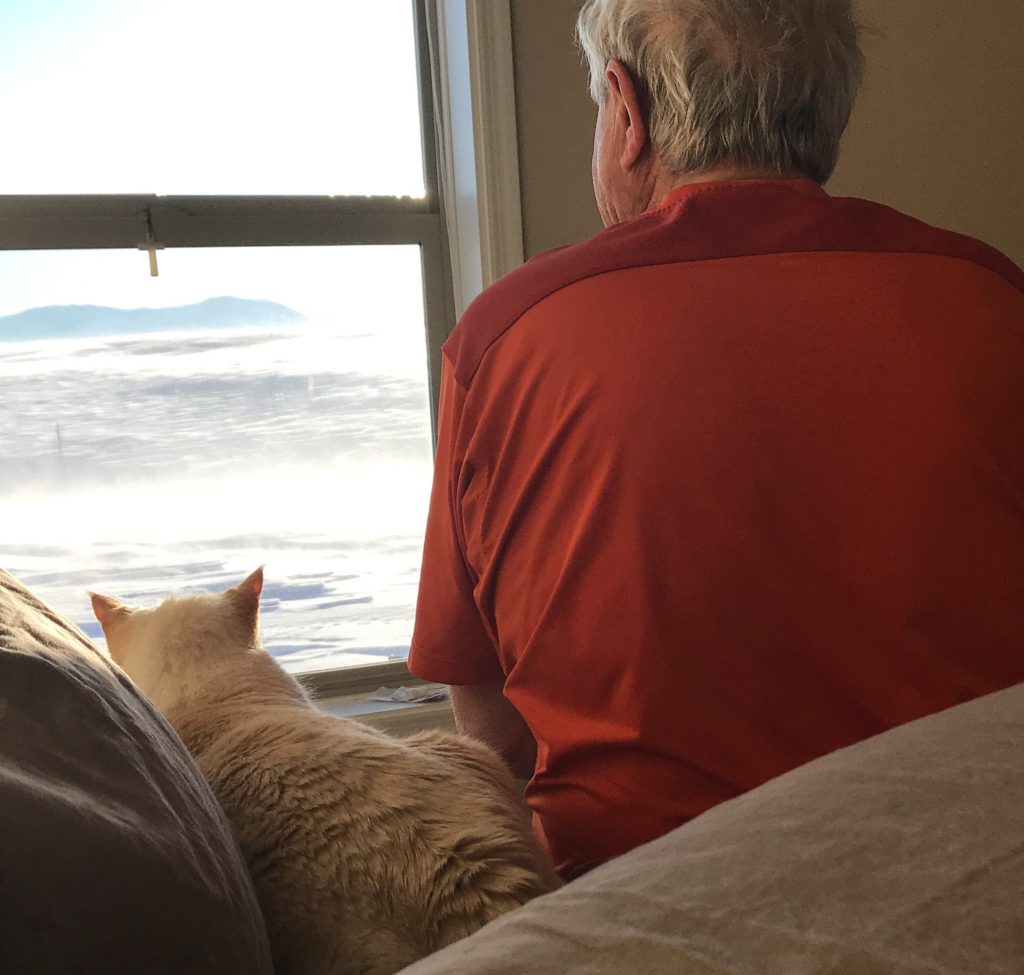Yesterday was a day of blowing snow. Here are Walt and Jade watching it go by the window.