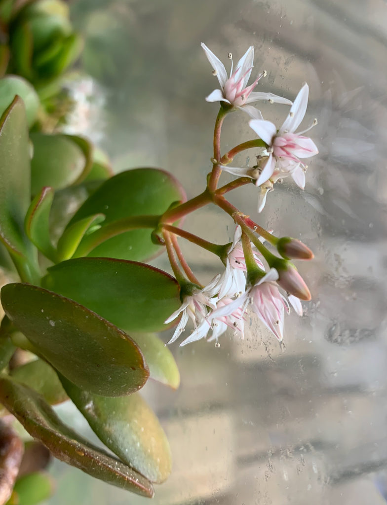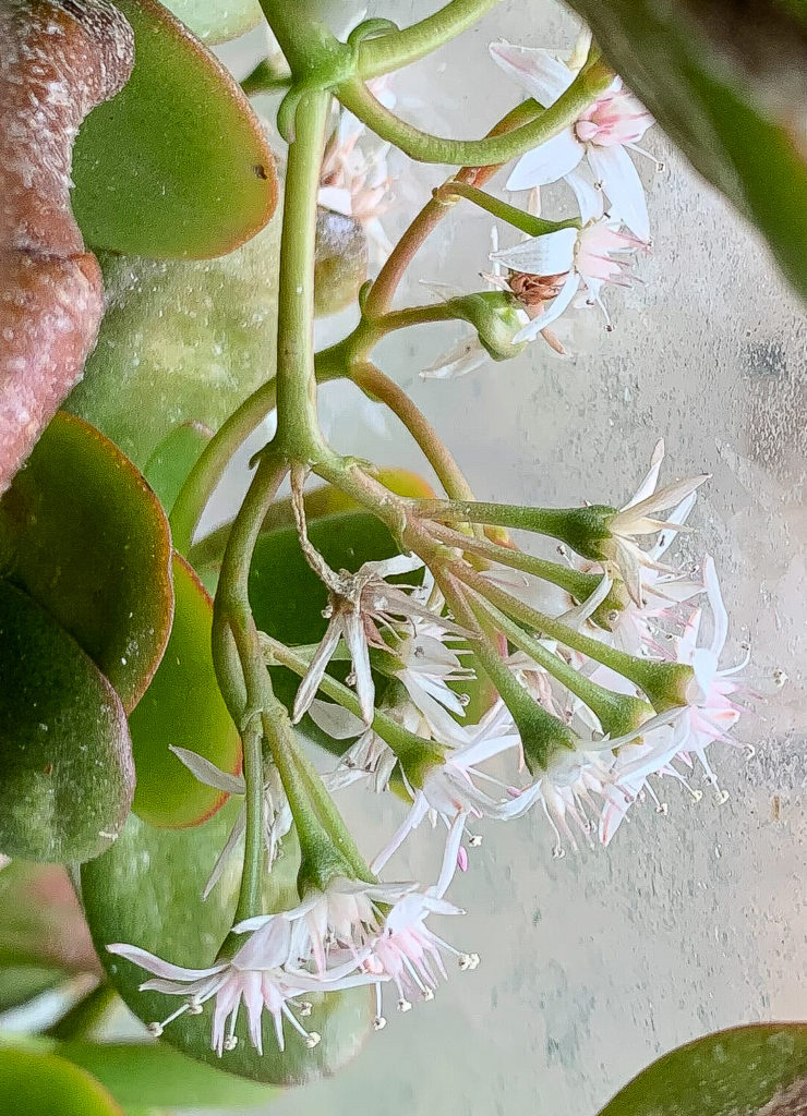 One of my Jade plants is blooming again. It seems to like the light this time of year. I couldn’t move it to get better shots.