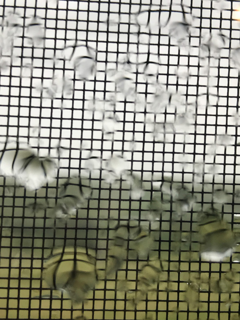The forecast rain arrived late afternoon yesterday and has continued all night and is pouring now. A little refraction using raindrops on the window screen.