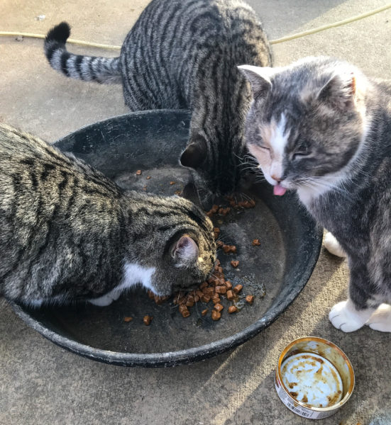 The Three Musketeers are enjoying their treat! The old gal looks like she is saying, yuck. But she was diving right in and just taking a quick breather.