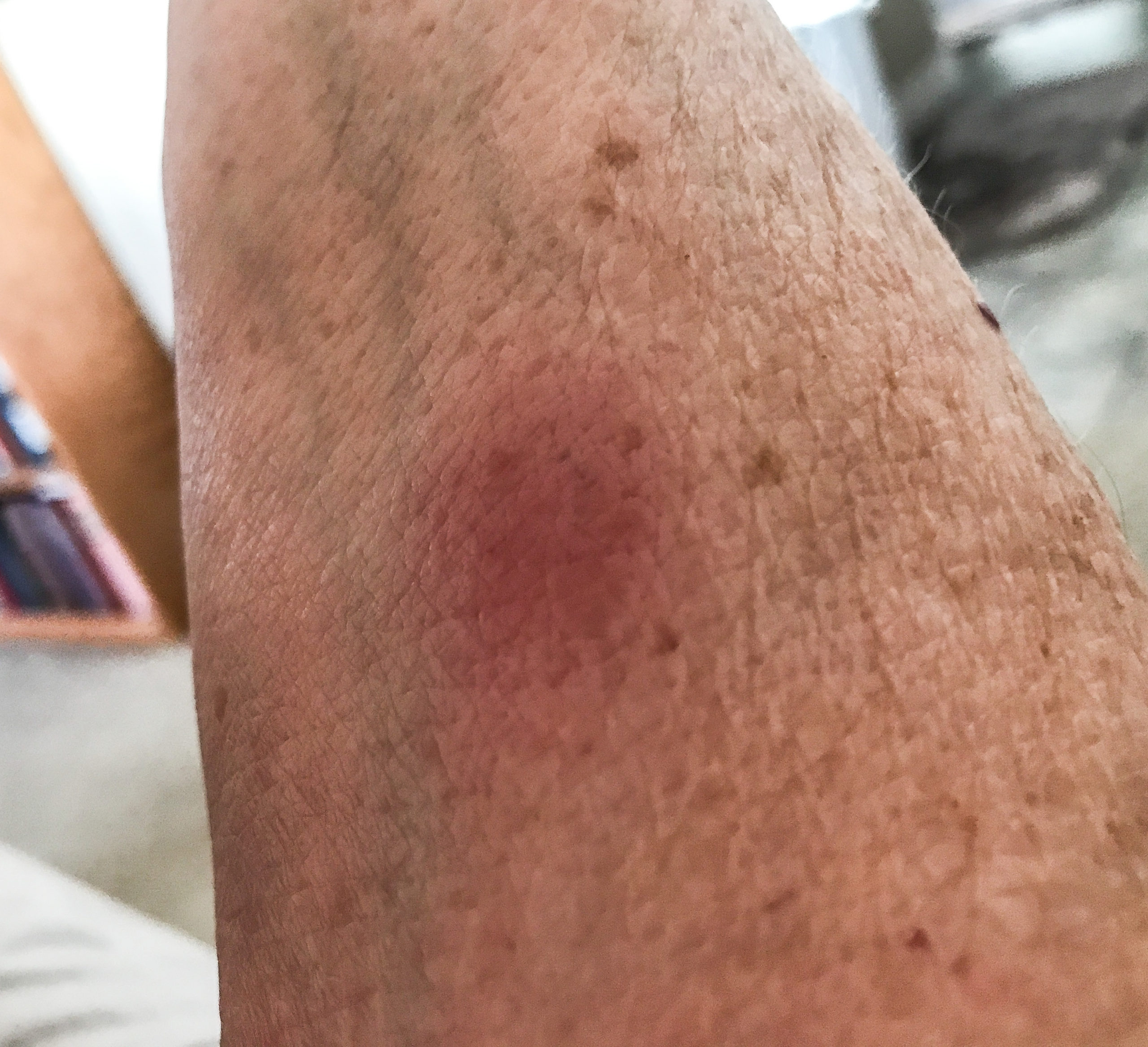 I still can’t believe I did this. I got my first Covid vaccination. My cousin arranged for it at the clinic and I had a doctor and nurses right there with me for the 4 hours it took to test me to see if it was safe. I passed the test for sensitivity. However, 11 hours later, I had this lovely red spot develop where they did one of the tests. I had been told earlier that if a red spot formed, the vaccination could not happen. So, now what? I got in touch with my cousin and she said Benadryl. It was bigger this morning, but she cleared it with the allergy department to just drink lots of water and use more Benadryl. I am fine. Both arms are sore, as they gave the shot in both arms(3 places). Now I get to wait my 21 days and return to another 4 hours of making sure I am a candidate for a 2nd shot. Here is a snapshot of my lower arm; a drop of vaccine was injected subQ there.
