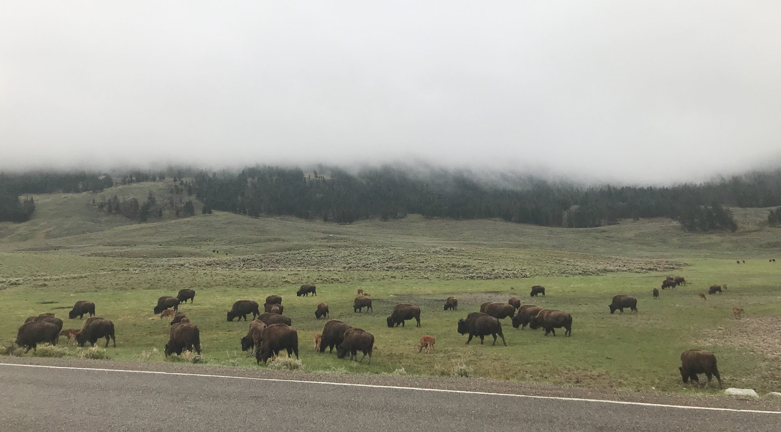 The Lamar didn’t get as much snow, but it looks like it is moving in here and it sure did later on. Just a small bunch of bison with babies.