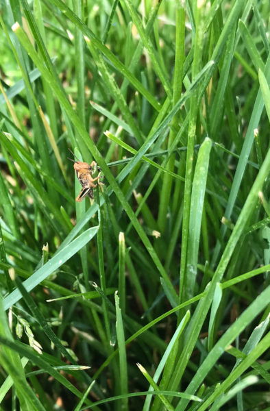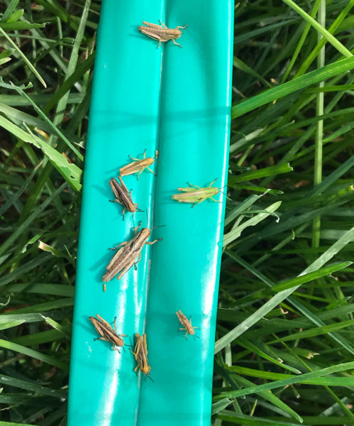 The baby grasshoppers have arrived in all sizes and colors. They are mowing the grass and hanging out on the soaker hose.