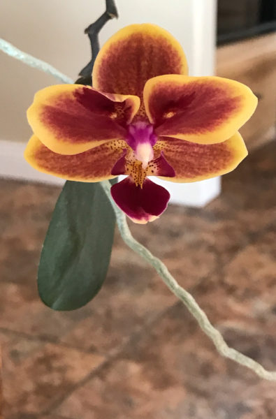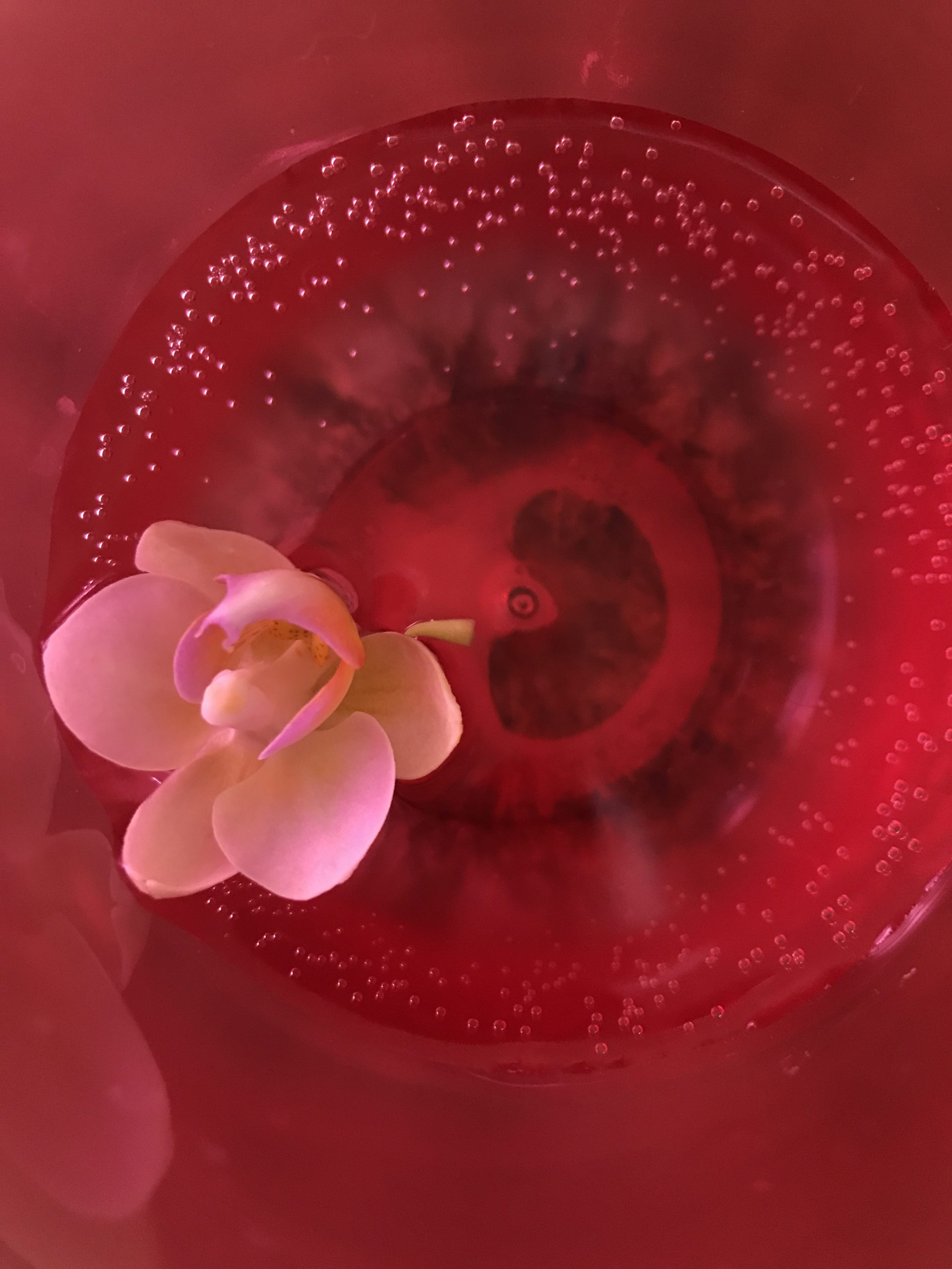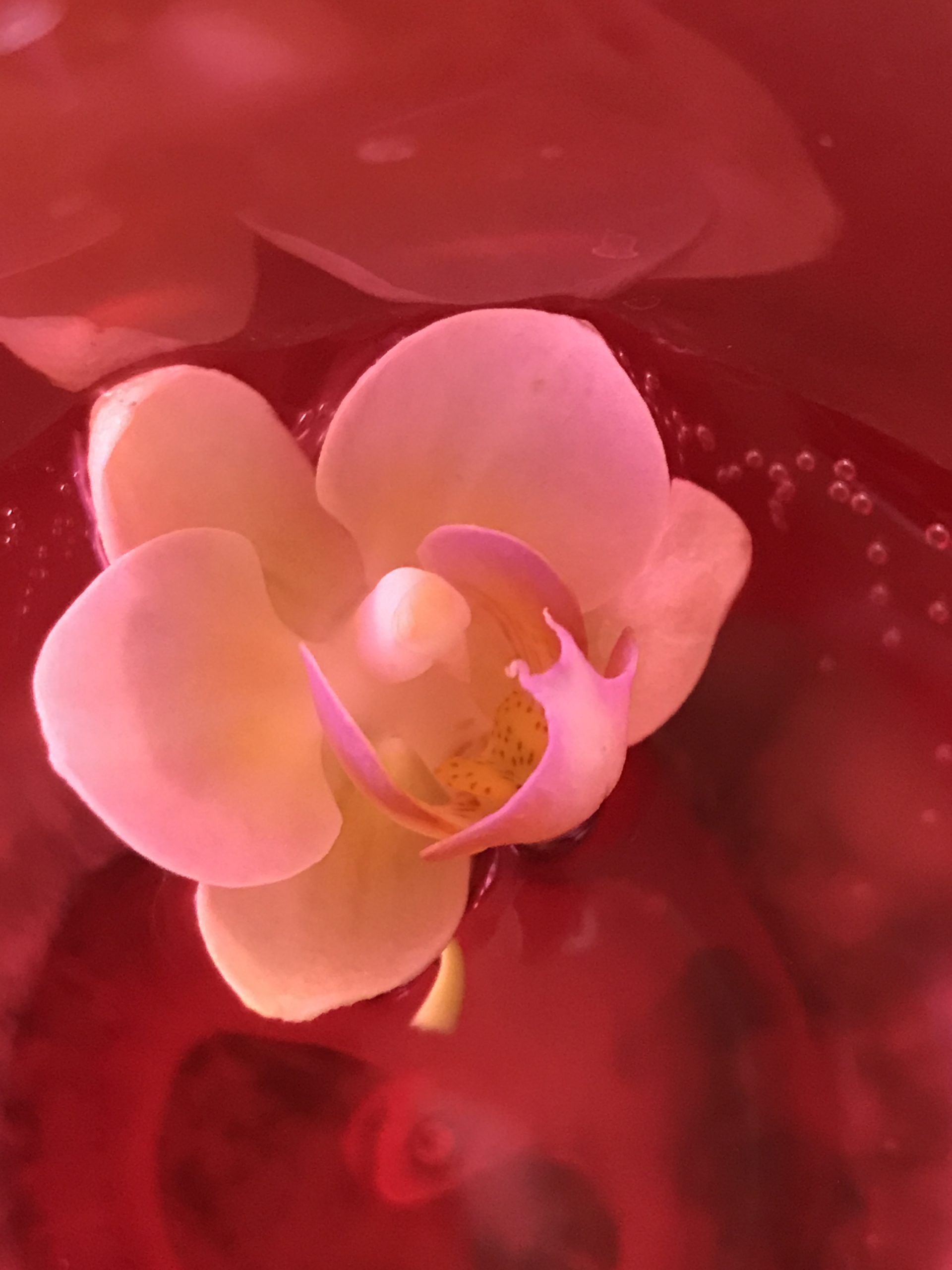 One of my new orchids lost a bud. I thought it was worth trying to see if it would open if put water. It worked! The orchid is white in a red glass.