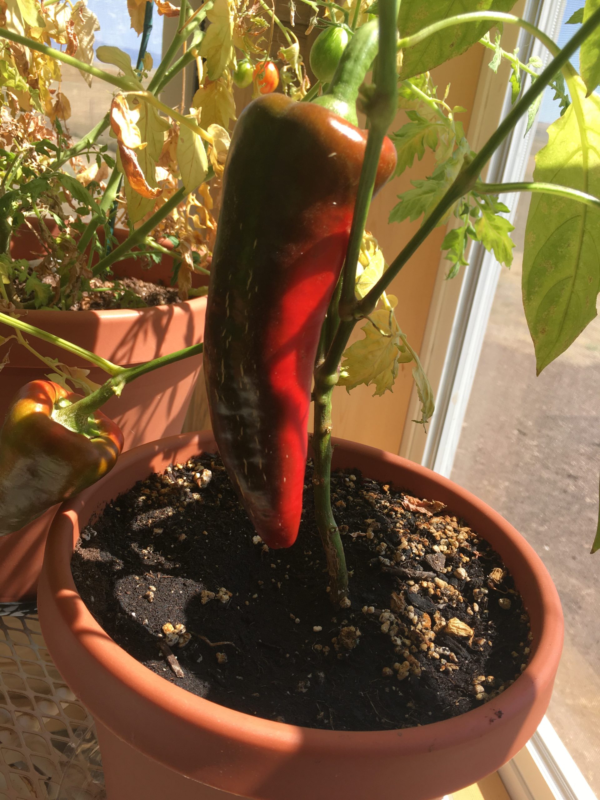 My peppers are ripening. Sad that the grasshoppers prevented the plants to be outdoors.