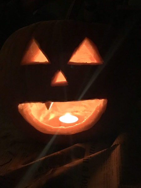 It’s a chilly Halloween morning. It was 11 degrees out when I got up at 5am. We did pumpkin carving last night with the grandkiddos. Here is one of the results.