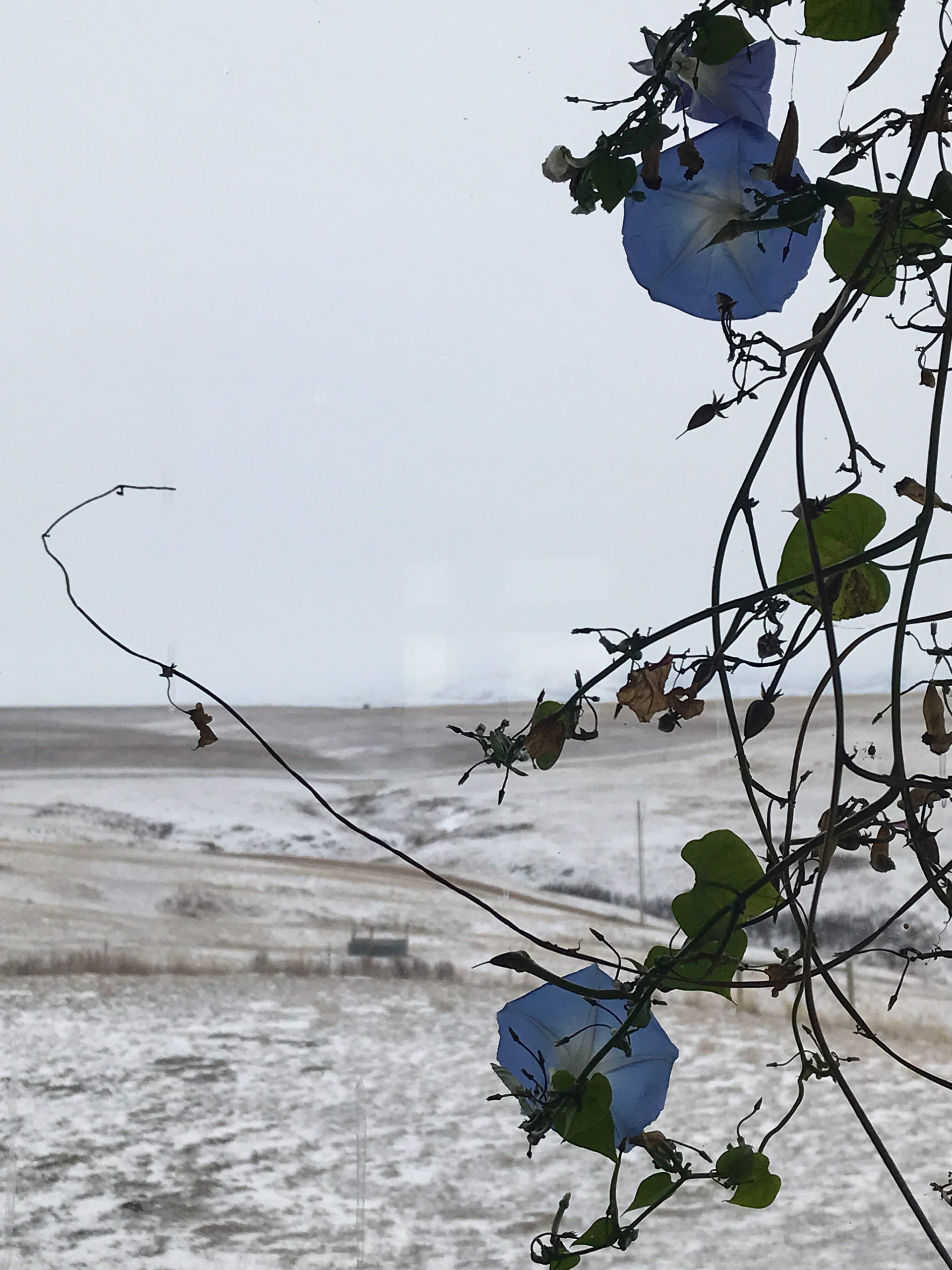 Today’s background out the sunroom window looking toward the Highwood Mountains is certainly different. Snowy again and colder. The Morning Glories, don’t mind though.