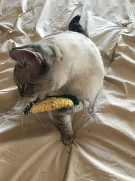My daughter crocheted a fun new taco toy for the spoiled kitty. She obviously loves it.