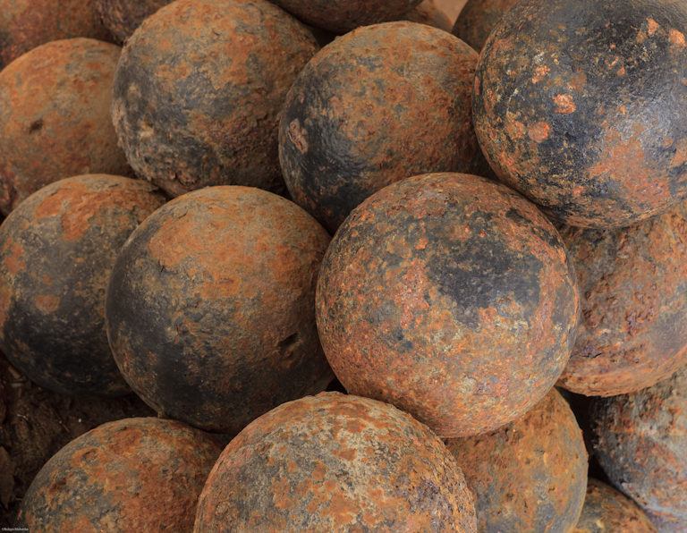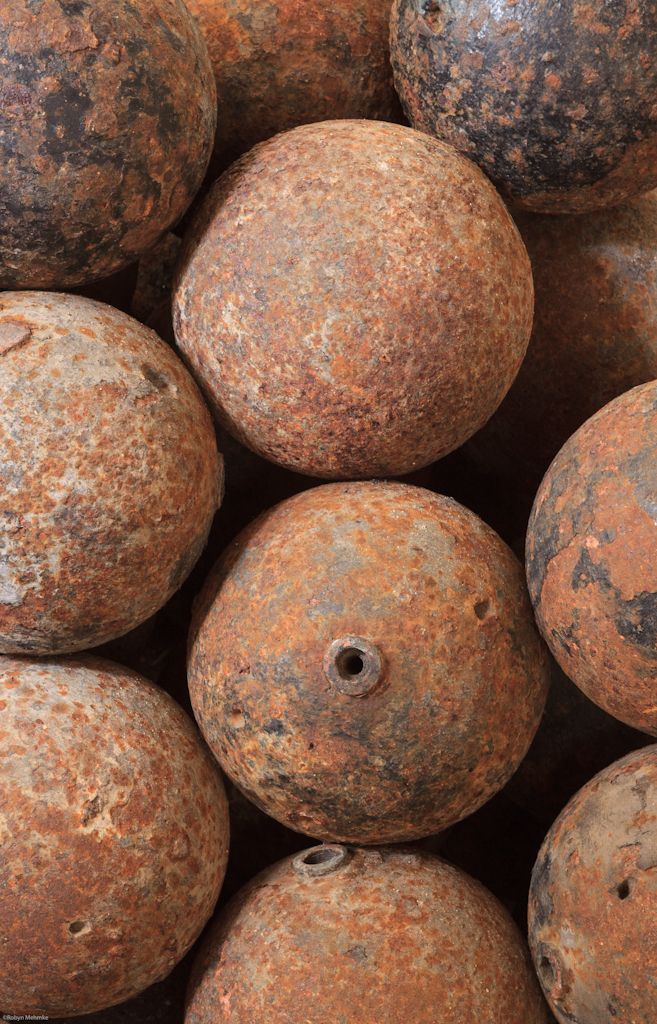 Fort Post was a very interesting place. My knees said no to climbing up all those stairs to the top, but I did have fun shooting at the lower level. Lots of neat texture there. These cannonballs caught my eye.
