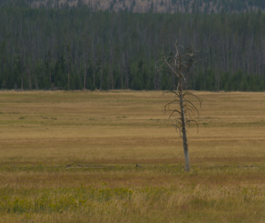 A wolf has been sighted! Really?? Sure, right there to the right of that lone tree out there on the flat. We looked and looked. Then drove down the road a bit farther and looked back to see this head peak out. Word had it that there was a pair of wolves(one black, one white) there and yes, I do believe I see one right there to the LEFT of the tree. Click on the photo and see what you think. That is one very large dog when you consider how far away it is and how big that tree is.
