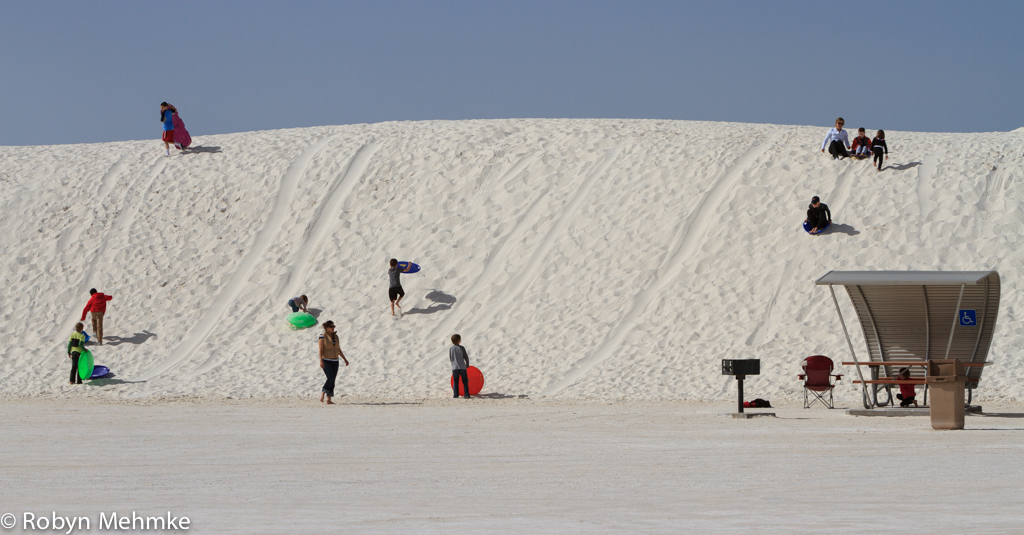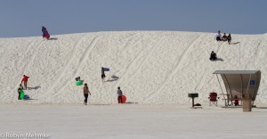 Wouldn’t it be fun to be a child again, at times? This is what the children do at White Sands, especially when it is spring break in New Mexico. Imagine getting to use your “flying saucer” to slide down hills of warm, white stuff. They sell the sleds in the gift shop and as you can see, they are everywhere. Â I kept thinking it would be so much fun for each and every one of my grandkiddos to enjoy this place.
