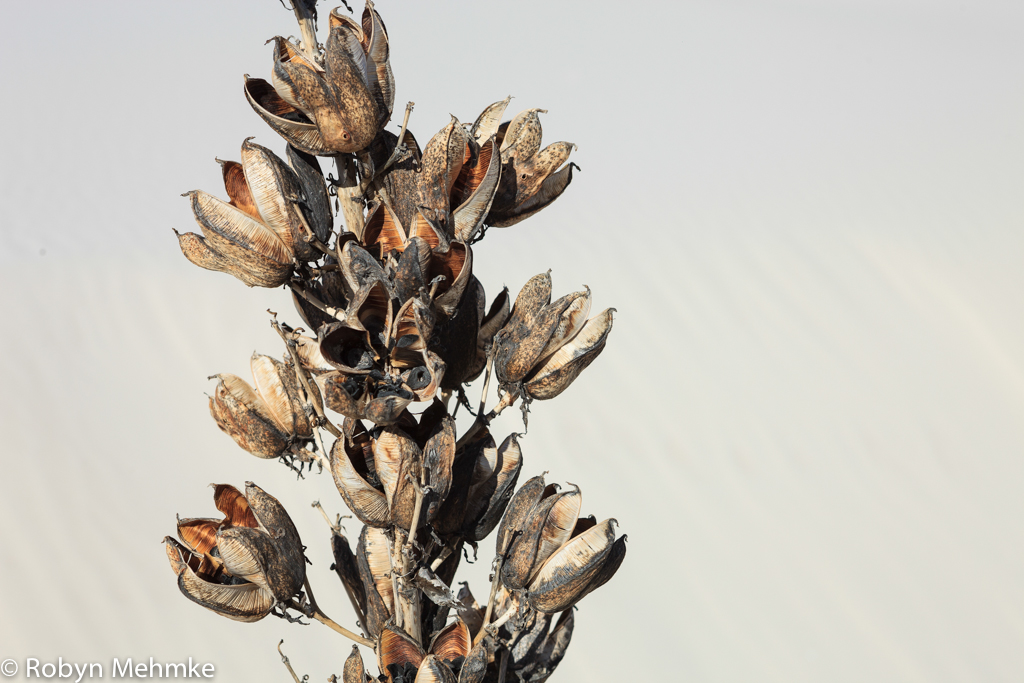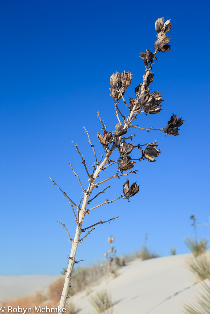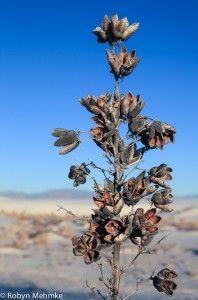 Here are the last three photos I will put up of the Yucca plant’s seedpods at White Sands. There is something very regal about these beautiful plants. They are fun to photograph; Â as the light changes, so does their color. They often appear a golden brown, but there are times when they are silvery too. They survive in the most challenging growing situation. Sand is constantly trying to take over their living space. So they have learned to survive by adapting to the situation by growing taller.