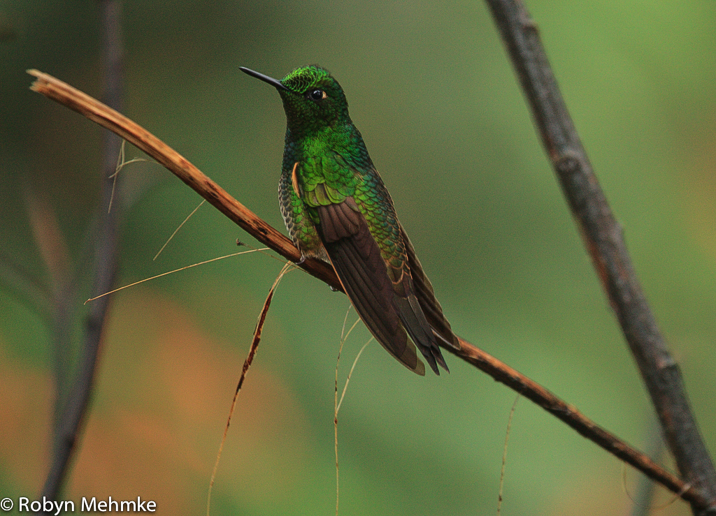 I waited patiently for quite some time to get this shot. You could tell by how the bark was worn off the branch that this was a favorite place for hummingbirds to land. It was right above the feeder and a perfect resting place. I just knew this would make a good place for posing. This little Buff-tailed Coronet obliged by landing there. What do you think? Â Click on the photo to enlarge. This was not a workshop, but a group of photographers traveling together. So each was on his/her own to find the shots. I do workshops too and like both ways for my photography traveling. I am very grateful to Tom Ulrich for inviting me along with his small group. I went to Africa previously with him and loved it. He knows where to go to get the good images. He is a good friend and fabulous photographer.
