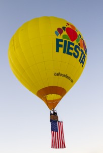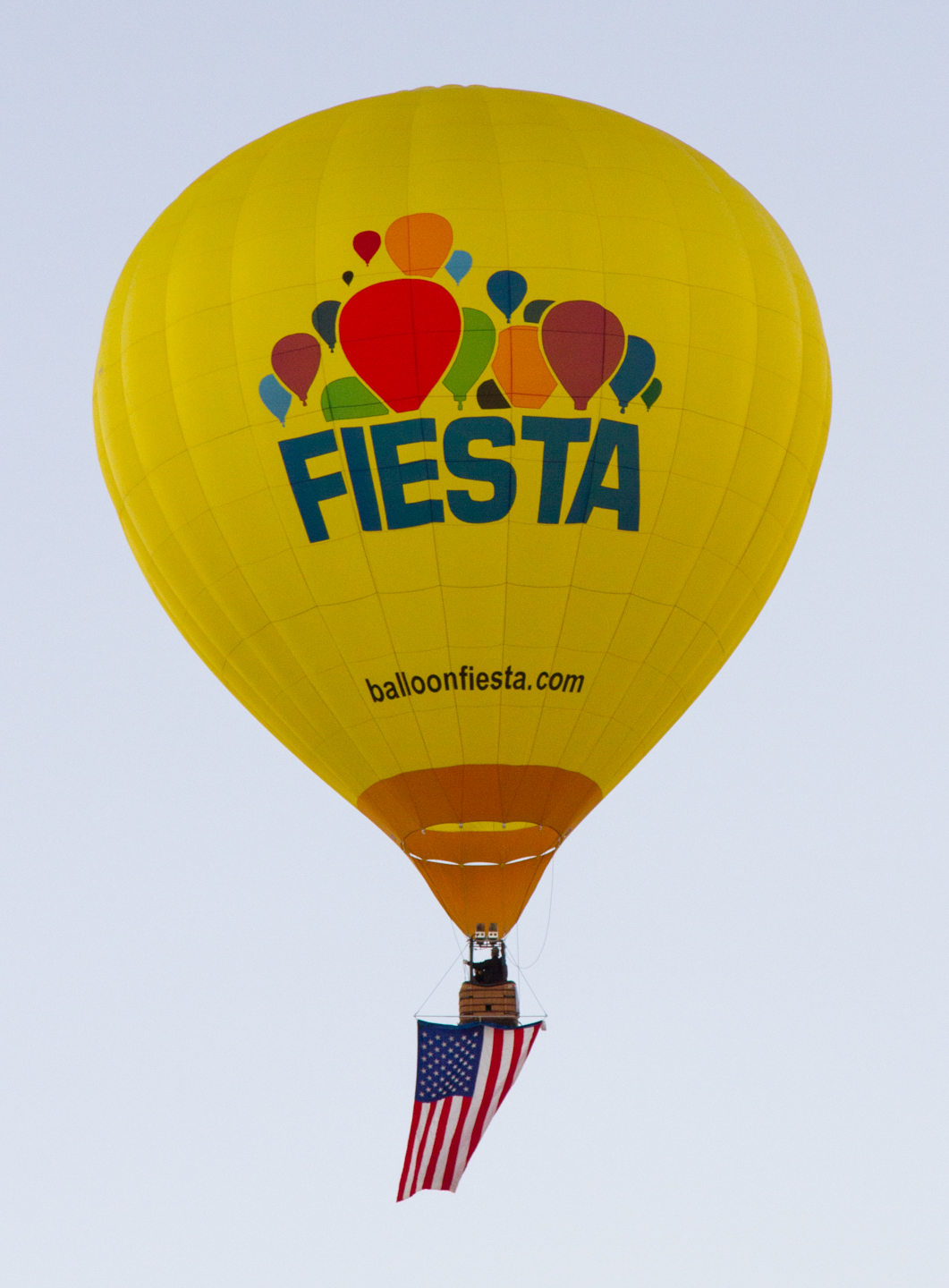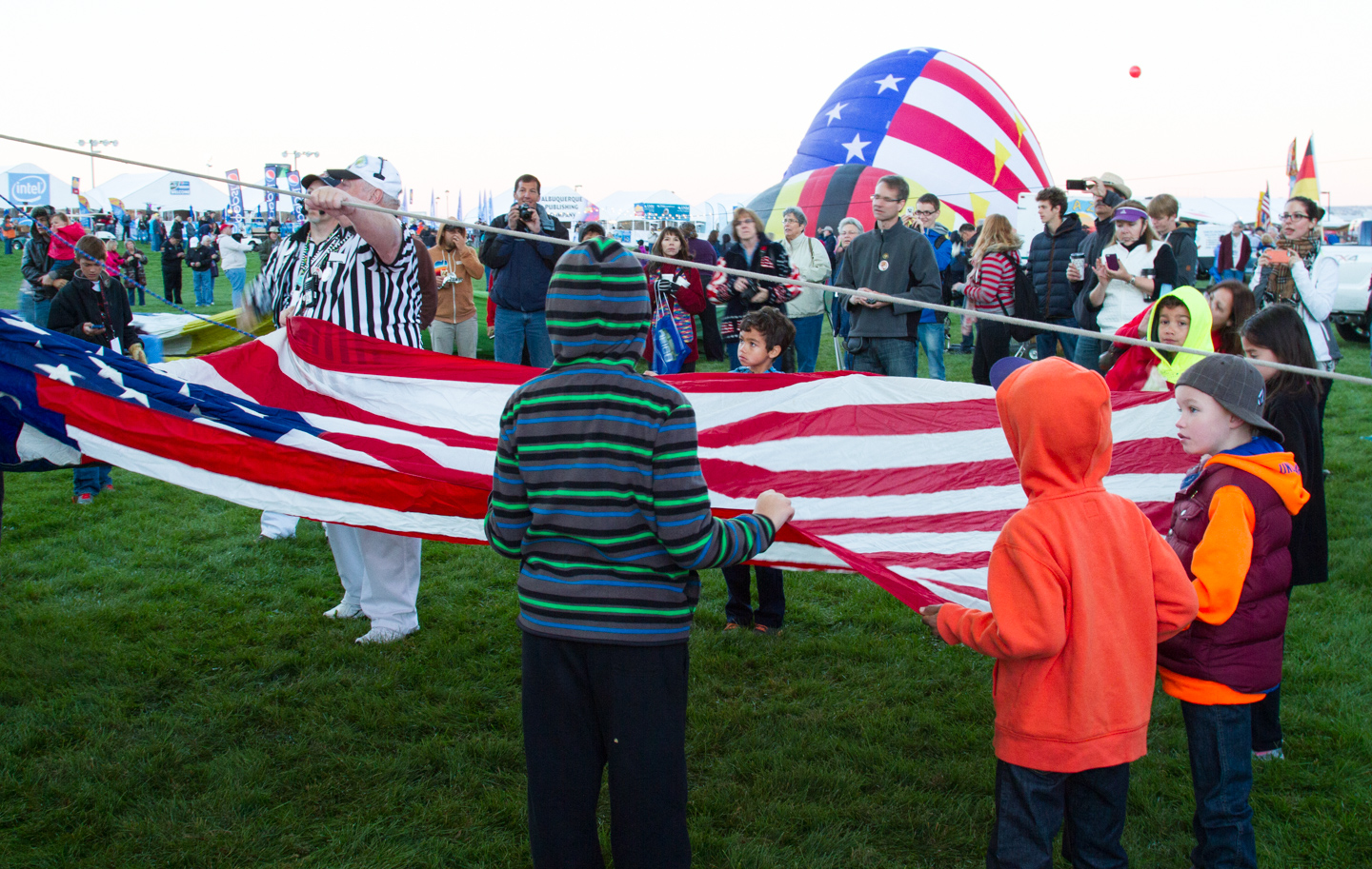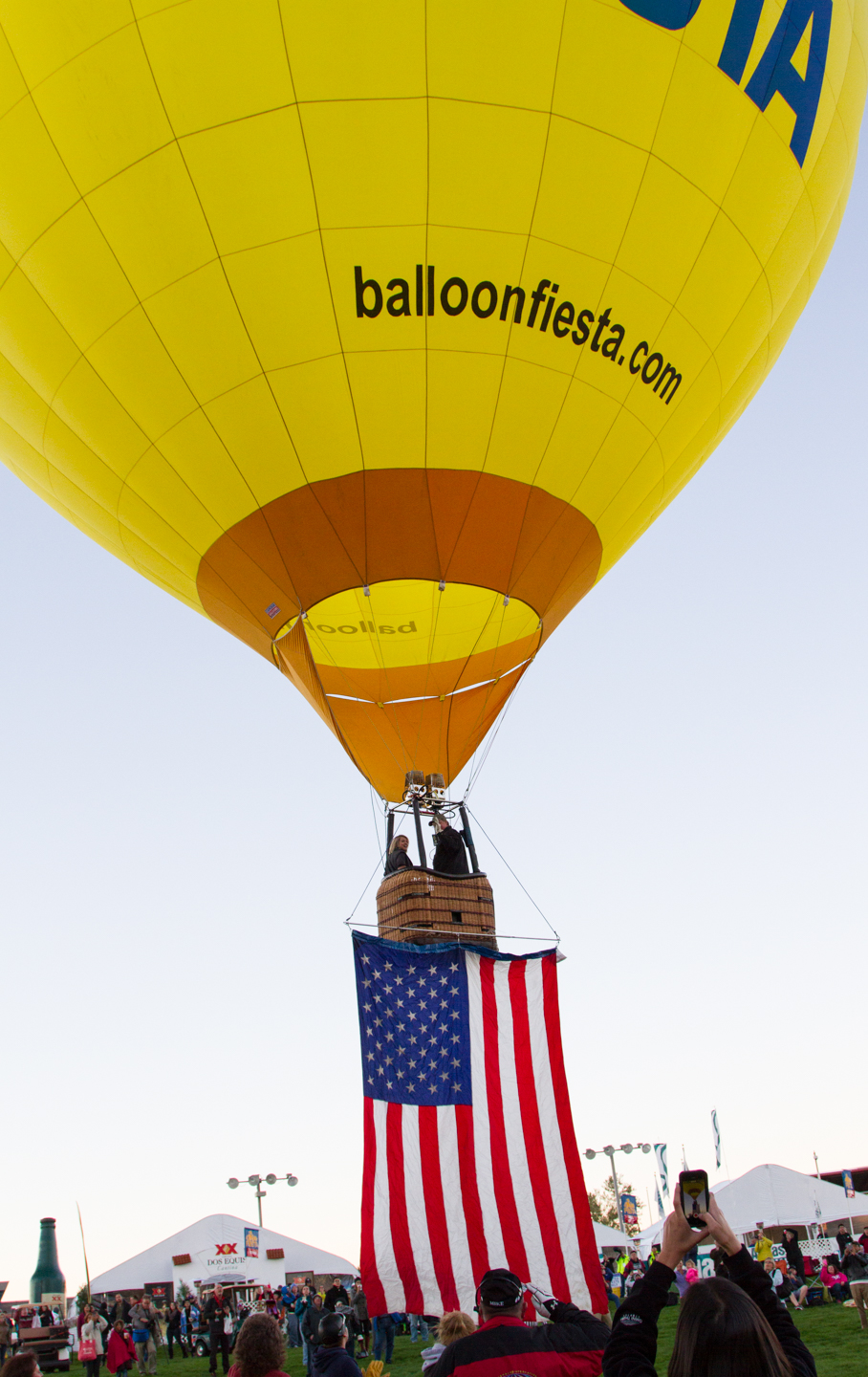The Fiesta Balloon is first to go up. School children get in on holding the flag. The national anthem plays and a young girl sings. And the Albuquerque Balloon Fiesta begins.