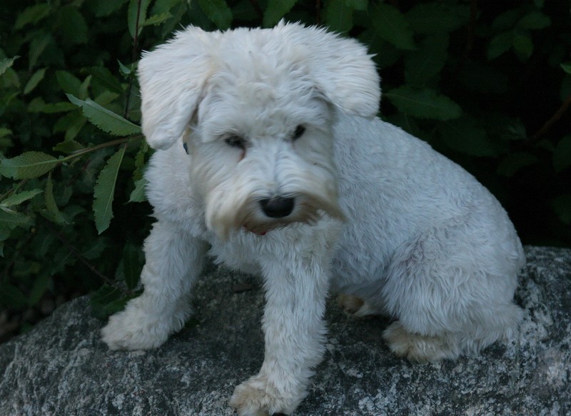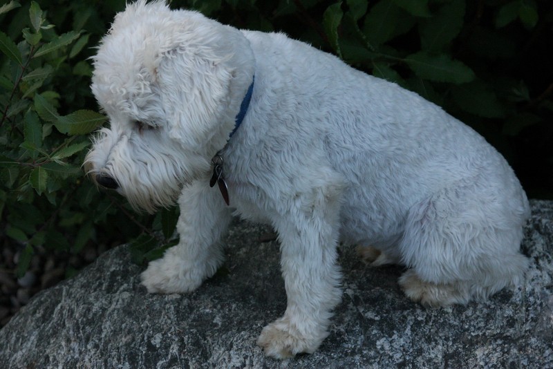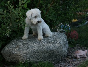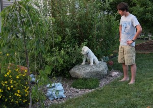 Sunday, July 19 – This is Bob and he belongs to Brooke, Chase and Brynn. He is the same dog that Marilynn is hugging in a previous post. I think he is a Schnoodle, but I might be wrong. Brooke and Chase will have to straighten me out on what breed he is. (Thanks, Brooke, for letting me know what breed they are. I was wrong that they were Labradoodles). They also have his sister, Clara. He has black skin, like a polar bear and his hair is curly. Clara has white skin and has straight hair. They are such pretty, well mannered dogs.  He likes to play statue sitting on this rock in their backyard.  It is a beautiful day today; supposed to be in the 80s and up to 90s on Saturday. I just hope the hail stays away. The guys are finishing up haying and will be starting to swath all the grain soon. It is already starting to turn golden all around here. The state fair starts next week and I am judging the rubber stamping again.