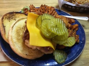 After yummy fried pickles what comes next at the Restaurant in Utica? A chicken sandwich with sweet potatoe fries.