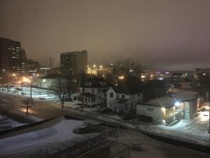 We are having freezing rain here; something Montana does not see often. It was treacherous yesterday and looks to be the same today. No walking for me. This was from our window in the wee hours this morning with some of the Mayo buildings on the left side.