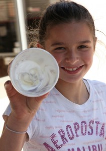 Tuesday, August 17 – I spent the day with 5 of my grandchildren and what a day it was!! I hope they had as much fun as I did. We first watched a movie, then went to Hempl’s for donuts, off to Amazing Toys and then to lunch at The Udder Company and followed with ice cream. Brooke decided she needed 9 scoops of ice cream on her cone which they actually do called a Moo-la-la. I could not believe that she ate the whole thing!! Here is a series of photos of her enjoying her dessert. Becca ordered the same thing, but didn’t quite get through the whole thing. I will have photos of more of our adventure the next couple of days. They even did a circus show for me this afternoon. Oh, dear, who ever would have guessed that house paint and nail polish would become face paint, in a 9 year old’s eyes.  They got the paint off just fine, but the red nail polish nose took some remover and scrubbing. They definately surprised me with their version of a clown for sure. What a fun day!!