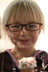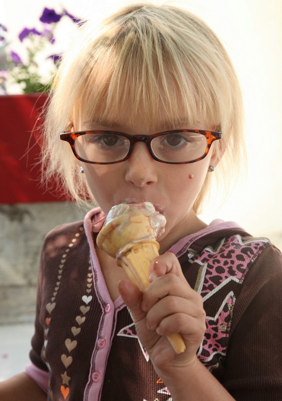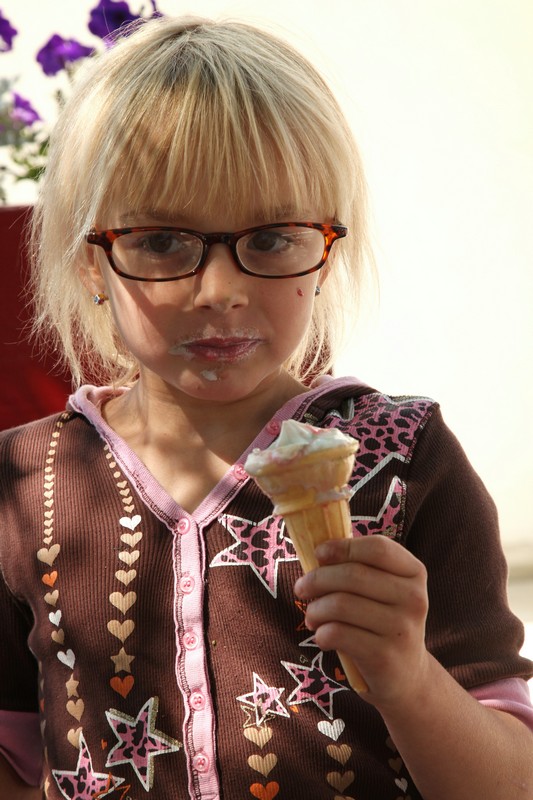 Friday, August 21 – Emma just got her 4th pair of fashion glasses. Her biggest wish right now is to have bad eyes, so that she has to wear glasses. I have worn glasses for over 50 years and can not understand why anyone would want to wear them. I guess they have such cute frames now and honestly , she has such a cute little face that they are perfect on her.  She enjoyed her ice cream as much as the rest, but I think her favorite was the Caesar Salad for lunch. That is her very favorite food. As you can see, she thoroughly got into enjoying that lettuce. Emma, you are quite the little eater.