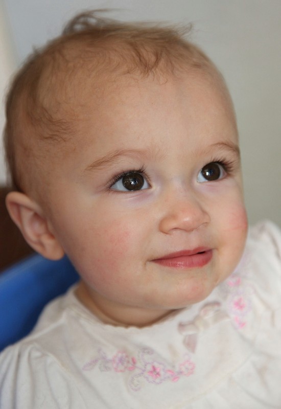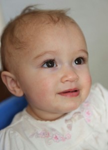 Thursday, December 3 – Here are a couple of shots of Lily before cake time. The after cake time ones will come later and they are doozies!! Nick did a great job of picking out bright pink frosting and did she ever have fun. Lily, you are going to be a real heart breaker!
