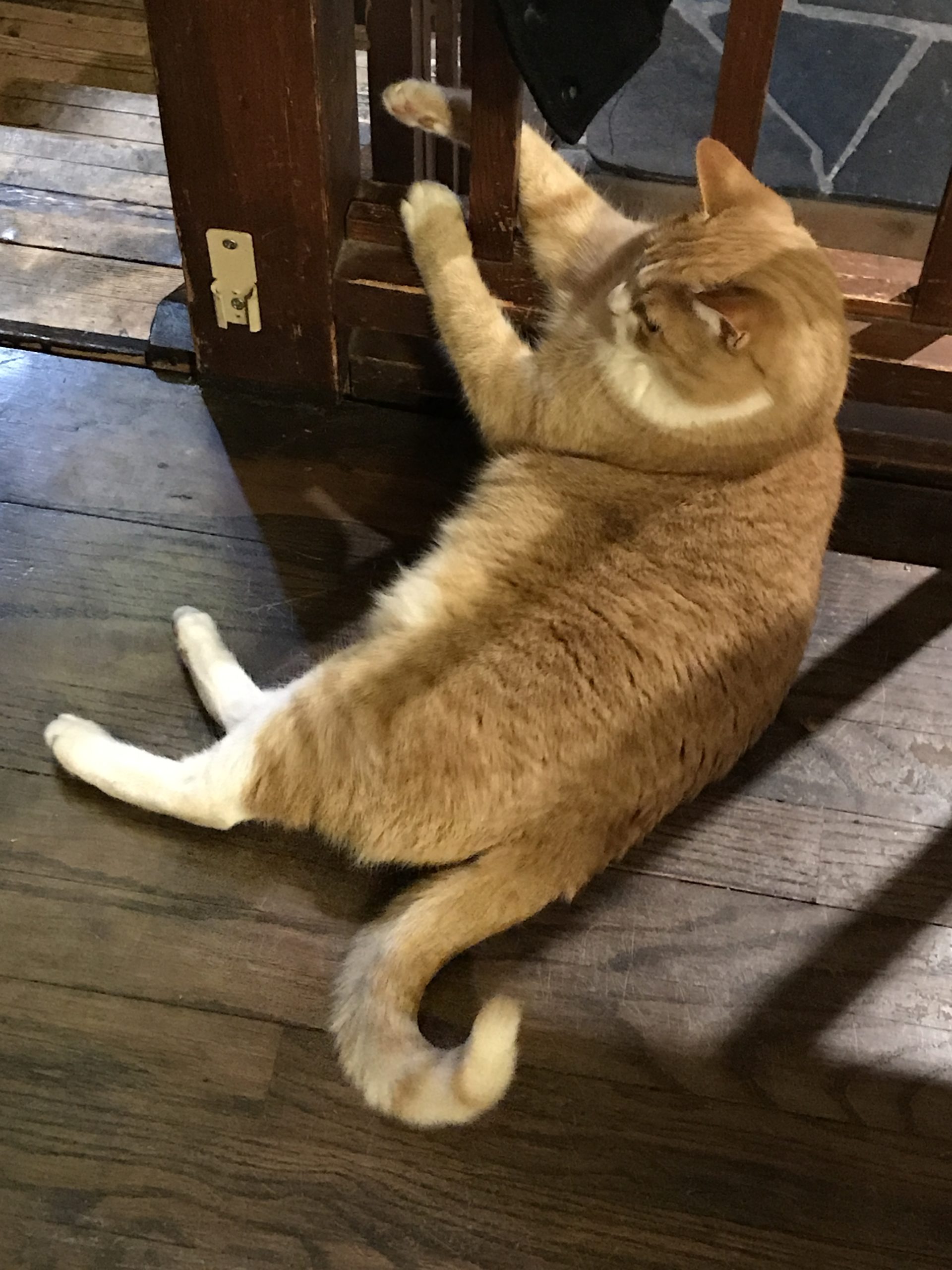 This is Ro’s cat that loves to play. She is being goofy by playing with the stair’s banister.