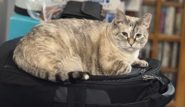 This is how Jasmine figured out how to keep me home. Sit on Mom’s camera bag.