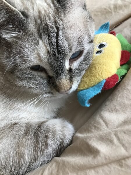 Jasmine got to bring her favorite toy the day she came to live permanently at my house. Mr. Taco is still around. We used to laugh how she carried him around everywhere with her. He even ended up in the water fountain at times.