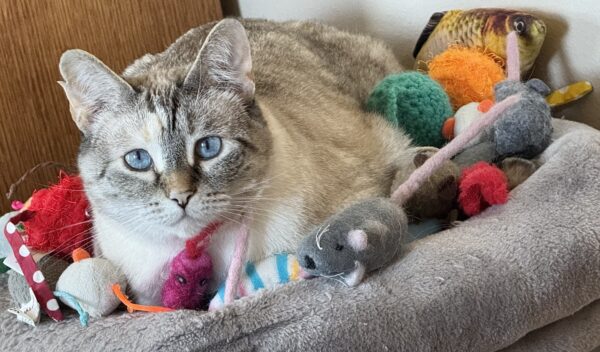 This is one spoiled cat. Look at all those toys and that is only a small part of them.