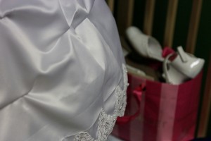 Monday, August 16 – Here is a shot from the wedding Saturday. The bride was having her hair done at the time and I saw an opportunity to shoot her dress with the shoes.  I had the kiddos overnight and they just left for home. Two baths!! They decided that they needed another bath this afternoon, just because. They can not get enough of that big bathtub with the bubbles. Lily had used a Sharpie on her legs and arms before she came yesterday, so the soaking was welcomed by her mom, I am sure. I just finished downloading The Prairie Woman Cooks on my itouch. It will be handy to have it along with me for shopping.