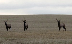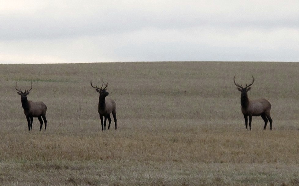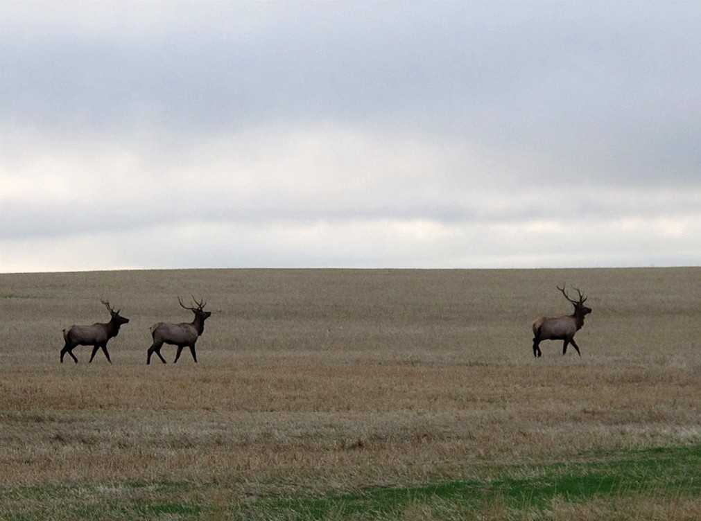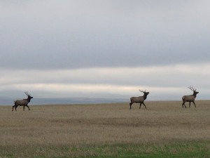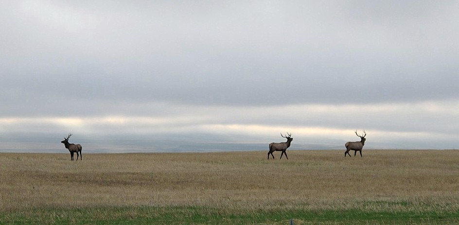 Wednesday, September 22 -Â This was the sight that greeted me as I came around a corner on my way home from Fort Benton Sunday. I guess nobody told these three big guys that hunting season is almost here or maybe, they are out for their last safe stroll. What a glorious sight to see first thing in the morning. I certainly would rather shoot them with a camera anyday.